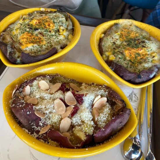 チーズ、メープルハニーなど美味しい焼きサツマイモ。さつまいもの甘みと味付けのアクセントが絶妙で大人気。