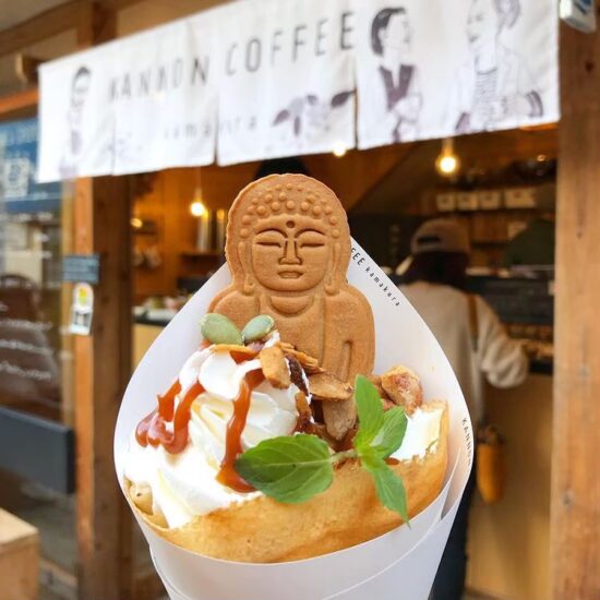 もっちり皮のクレープに鎌倉大仏のビスケットをトッピングしたインスタ映えグルメ。可愛さだけでなく、生クリームの甘さなど絶妙のテイスト。