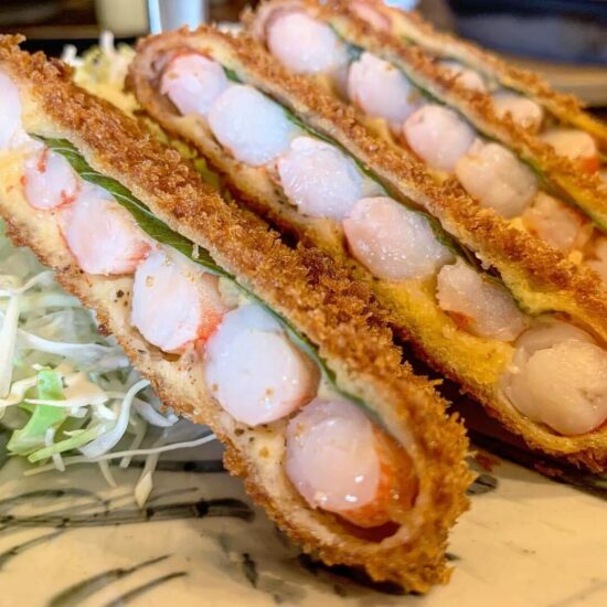 インパクトが絶大の海老カツ。エビがプリプリで衣はサクサク絶品グルメです。名古屋で人気の定食屋ですよ。