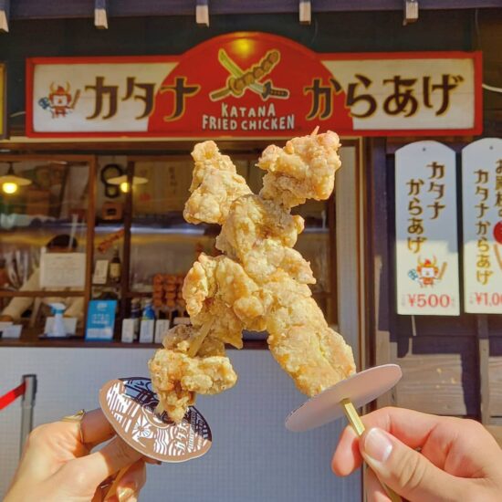 ジューシーな鶏の唐揚げが串に刺さった絶品グルメ。見た目もカタナのようでインスタ映えします。