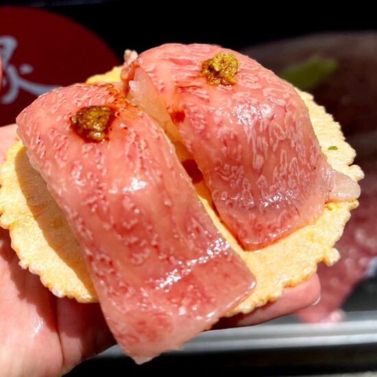 松坂牛のくどくない脂身が舌を唸らせます。ワサビとシャリとの相性も抜群の絶品食べ歩きグルメです。