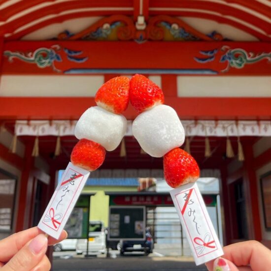 季節のフルーツを使ったインスタ映えスイーツのいちご大福。恋みくじ付きのいちご大福の串も食べ歩きにぴったりでおすすめです。