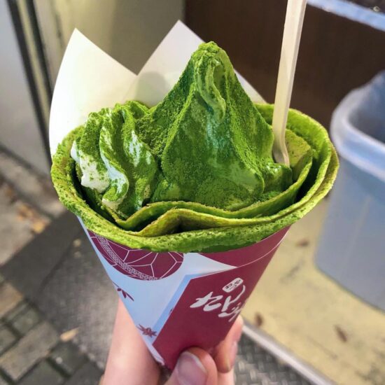焼ããŸã¦ã®ç¾Žå‘³ã—ã„クレープãŒå‘³ã‚ãˆã‚‹ã€‚京都らã—ã„æ¿ƒã„抹茶を使ã£ãŸãƒ‘フェã®ã‚ˆã†ãªã‚¯ãƒ¬ãƒ¼ãƒ—ãŒå¤§äººæ°—。