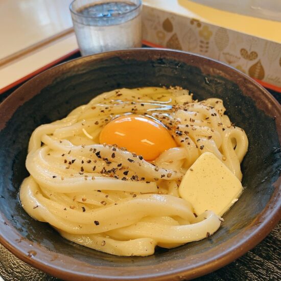 モチモチでコシのあるうどんが魅力的!バターと卵の相性が良く、背徳感ある絶品のうどん。絶妙な濃厚さが食欲をそそる。