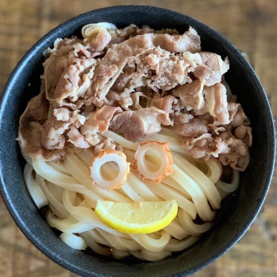 限定食の「肉うどん・肉ぶっかけ」コシのあるうどんにレモンの酸味とつゆの甘みが重なった絶品のうどんです。