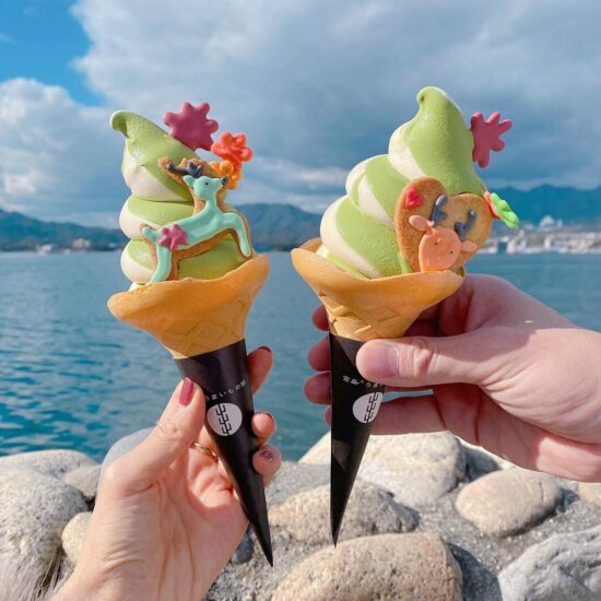 宮島らã—ã„坿„›ã„クッã‚ーãŒä¹—ã£ãŸç¾Žå‘³ã—ã„ソフトクリーム。ãƒãƒ‹ãƒ©ãƒ»æŠ¹èŒ¶ãƒ»ãƒŸãƒƒã‚¯ã‚¹ãªã©äººæ°—ã®ãƒ•レーãƒãƒ¼ã€‚