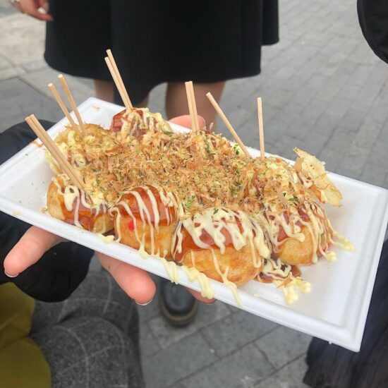 マヨネーズ・鰹節・ソースなどこだわった素材を使った魅力的なたこ焼き。アメ村食べ歩きで小腹が空いた時にも最適です。
