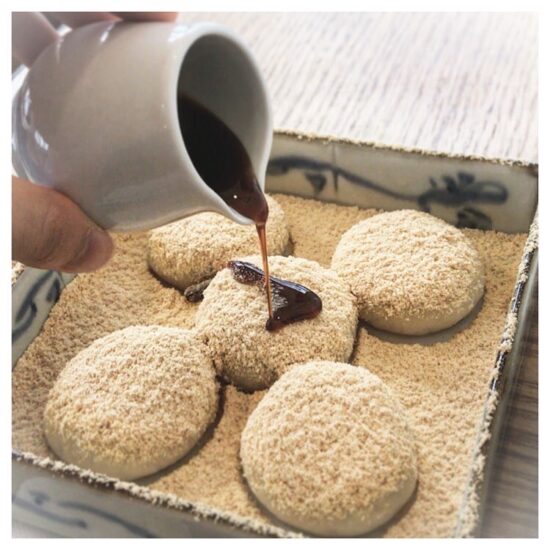 もっちり柔らかい白玉にきな粉と黒蜜がかかった絶品和スイーツ!きな粉と黒蜜の上品な甘さが白玉の風味を引き立てる。