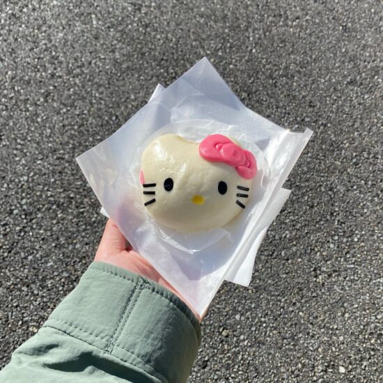 可愛いハローキティの形をしたキャラクターまんが大人気。熱々のチーズが中に入った絶品食べ歩きグルメです。