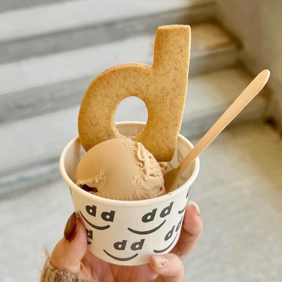 店名の頭文字をとったdのクッキーとアイスクリーム。見た目の可愛さも魅力的。餡がぎっしり詰まったどら焼きも美味しい!