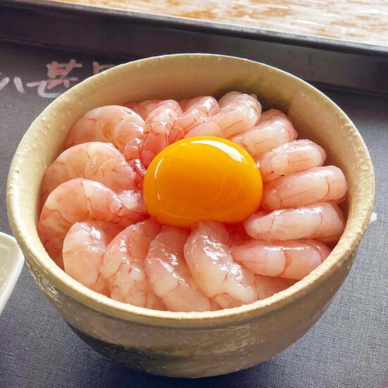 三重県の唯一の底引網船で獲った珍しいガスえび。甘エビのような甘みとプリプリ食感の絶品海鮮です。黄身を崩して食べる海鮮丼は超絶美味です。