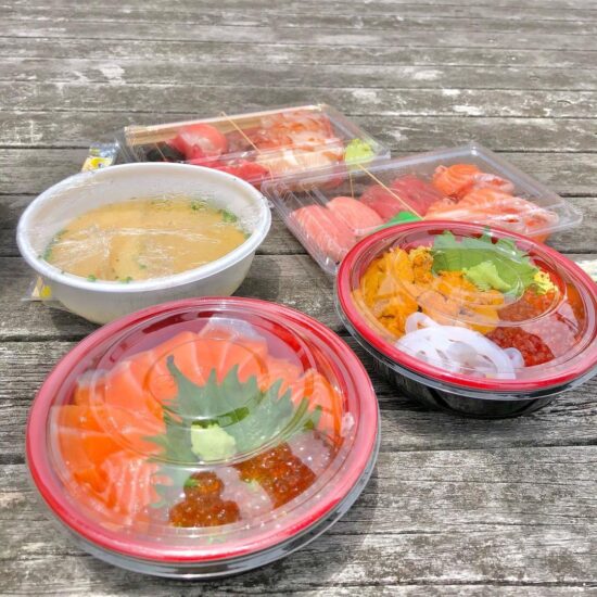 色々な魚屋さんや店が出店しているので、選び放題で、寿司は都会では味わえない新鮮な味でとても美味しいこと間違えなし!